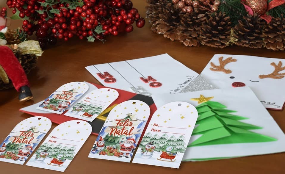 Tags e cartões natalinos para você imprimir, deixando seus produtos com acabamento profissional e encantando seus clientes.